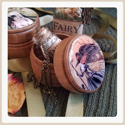 Details: Size: 2.25 inches diamater and 2.5 inches tall. Material: High quality pine wood. Stained with a natural finish. Artwork featured on the lid protected by a clear resindome.